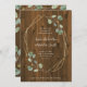 This rustic and trendy wedding invitation features romantic watercolor eucalyptus leaves and foliage on a faux gold geometric centre frame. The background is made to look like rustic brown wood. There is a space at the bottom with the option to add your wedding website. A simple yet stunning look for your modern wedding.