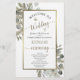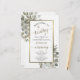 These wedding programs are elegant and tasteful, while still being budget friendly. The design features a faux foil golden frame with hand painted watercolor sprigs of pine branches and eucalyptus leaves in muted shades of sage green, grey, and gold. The typography features lacy script calligraphy, and there is room for details on the ceremony, the bridal party, and a short thank you.