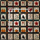 This fabric showcases a rustic quilt-inspired pattern arranged in squares and rectangular blocks with warm autumn motifs. The patchwork features pumpkins, a black bird with a reddish breast, hearts, red stars, and floral branches in earthy shades of red, orange, and brown. Geometric accents like plaid and cross-stitch textures add to the handmade feel. With a cozy farmhouse aesthetic in black, cream, and fall tones, this pattern is perfect for autumn décor, primitive country style, and rustic harvest season charm.