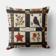 This throw pillow showcases a rustic quilt-inspired pattern arranged in squares and rectangular blocks with warm autumn motifs. The patchwork features pumpkins, a black bird with a reddish breast, hearts, red stars, and floral branches in earthy shades of red, orange, and brown. Geometric accents like plaid and cross-stitch textures add to the handmade feel. With a cozy farmhouse aesthetic in black, cream, and fall tones, this pattern is perfect for autumn décor, primitive country style, and rustic harvest season charm.