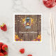 Rustic country fall napkins featuring a wooden barn background, autumn leaves, a candle lit lantern, string twinkle lights and a modern text template.