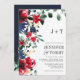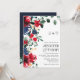 Rustic fall winter red navy blue floral wedding invitation with pretty red peonies, navy blue flowers in a floral watercolor bouquet with a modern font, add your initials or monogram.