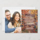 Outdoor autumn wedding invitations featuring a romantic fall woodland setting, string twinkle lights, a photo of the future mr & mrs, and your wedding information written on a rustic wooden signpost.