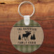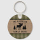 A beautiful, rustic themed round keychain, featuring your family name and cabin, lodge, cottage or other desired text and its established date. This unique, custom design features a silhouette of a bull moose and pine trees on a burlap style print, accented with beautiful French country plaid in soft shades of grass and sage green. To see more designs like this, feel free to visit my store here at "Zazzle.com/Rustic_Charm". Thanks.