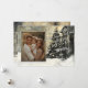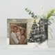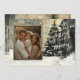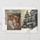 This personalized Christmas card features a space for a heartwarming family photo framed with a rustic wooden border. Next to the image is a beautifully decorated Christmas tree covered in snow, set against a snowy backdrop. The message on the card reads, "Warmest wishes for the Season's best and brightest joys! With Love from, your family name written in an elegant, flowing script. The design blends warm golden tones with wintery scenery, creating a cozy and festive vibe, perfect for spreading holiday cheer.