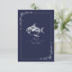 Wedding RSVP with fish illustration with botanical seashell border. Background is dark blue.