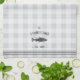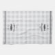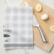 Customize your kitchen with this cute personalized towel featuring your family name or house name and year established in rich charcoal grey lettering accented with a fish illustration on a tonal plaid background.