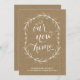 This elegant, rustic "new home" announcement features a pretty floral wreath, calligraphy, and the text "Our new home," against a kraft paper-style background.