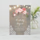 Rustic barn / farm birthday party invitations features an amazing pink floral bouquet, string of lights, lace, and wood.