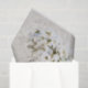 Beautiful design featuring white flowers in a white vase with vintage ephemera in shades of blue and grey.