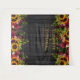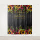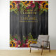 Gold yellow sunflowers and dark red burgundy roses bouquets borders on a dark brown barn wood background with your custom script in faux gold typography making a beautiful photo booth rustic wedding backdrop. ++++++++++ Easy to personalize and perfect for late summer, autumn fall or winter rustic vintage traditional themed weddings.