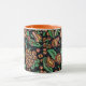 Coffee Mug in Rustic Fruit & Floral design. Shades of orange, peach, green, and blue on a black background. Orange handle and interior.