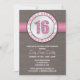 Custom pink Sweet Sixteen (16) milestone Birthday Invitations featuring a printed glitter illustration for the "16" in a "SWEET SIXTEEN CELEBRATION" emblem design, over a rustic dark grey canvas texture image.