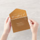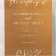 This rustic gold gradient all in one wedding invitation features elegant white typography overlaid on understated earth tones and a detachable RSVP card. Simple light orange and bronze hues follow the current fall trends for a bohemian wedding this autumn. Complete the look with your minimalist script over the colour fade.