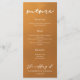 Ce menu rustique de dîner mariage d'or présente une élégante typographie blanche superposée sur un dégradé de tons de terre sobre. Les teintes simples orange pâle et marron suivent les tendances d'automne actuelles pour un mariage bohème cet automne. Complétez le look avec votre script minimaliste sur la fondu de couleur dans cette liste de cours.