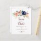 This rustic gold leaves and floral save the date postcard is perfect for a modern wedding. The design features hand-drawn watercolor purple, navy, blush, burgundy, navy flowers, green and gold leaves adorning an elegant geometric frame.