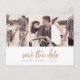 This rustic gold script 3 photo save the date postcard is perfect for a country wedding. The simple and modern gold and white design features unique whimsical handwritten calligraphy lettering with a contemporary minimalist boho style. Customizable in any colour. Keep the design minimal and simplistic, as is, or personalize it by adding your own graphics and artwork.