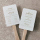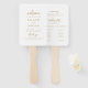 This rustic gold script wedding program hand fan is perfect for a country wedding. The simple and modern gold and white design features unique whimsical handwritten calligraphy lettering with a contemporary minimalist boho style. Customizable in any colour. Keep the design minimal and simplistic, as is, or personalize it by adding your own graphics and artwork. Include the name of the bride and groom, the wedding date and location, thank you message, order of service, and bridal party. Order your programs assembled or non-assembled.