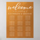 This rustic gold wedding seating chart features elegant white typography overlaid on an understated earth tone gradient. Simple light orange and brown hues follow the current fall trends for a bohemian wedding this autumn. Complete the look with your minimalist script over this color fade welcome poster.