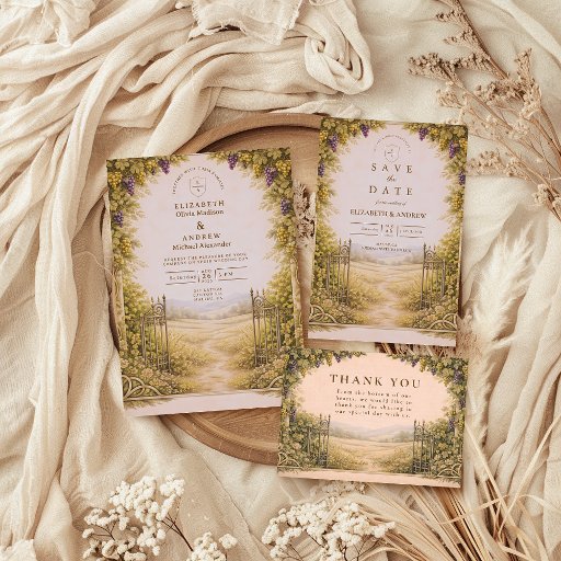 A romantic countryside garden design featuring lush grapevines, an open wrought-iron gate, and a soft meadow path leading into a timeless outdoor setting. Inspired by European garden estates and vineyard-style landscapes, this artwork blends rustic charm with classic elegance. Ideal for couples planning an outdoor celebration with natural greenery, vintage details, and a relaxed countryside atmosphere.