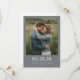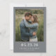 This wedding save the date features a heartfelt photograph of a couple embracing in a field, surrounded by tall grasses. The design is framed with a solid grey border and includes customizable text for the date and names, set in elegant serif fonts that add a touch of sophistication. The colour palette consists of natural greens and browns from the background, contrasted with denim blue, creating a rustic and intimate theme. The overall mood is warm and personal, perfect for celebrating love and togetherness on your special day.