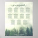 This elegant wedding seating chart has table assignments for 110 guests at 11 tables (10 people per table.) The design is rustic yet elegant, featuring a woodland mountain scene with a hillside covered in a foggy green pine tree forest. The title reads "please find your table" in lacy script calligraphy. There is space for the names of the couple and wedding date.
