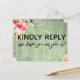 Both the back and front were accented with pretty, colourful watercolor flowers. In editable text "kindly reply" was placed, large and bold, on the front. In a modern casual handwriting, a graphic depicting "we hope you can join us!" appears below. On the back, the same unique font was used to create graphics that read "rsvp", "m", "kindly deliver to:" and "menu choice for each guest:" All other text is editable. Use the template fields to personalize as much as you wish. The background is covered in rustic green wood imagery. // 100 //