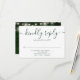 A rustic RSVP card with your details set in chic typography and personalized with your names and hand-drawn floral foliage and string lights on a rustic emerald green wood panels background on the reverse. Designed by Thisisnotme©