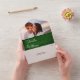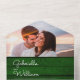 All in one wedding invitation featuring pretty string lights, your photo, monogram initials and elegant modern minimalist typography on a rustic emerald green wood panels background. The invitation includes a perforated RSVP card that can be individually addressed or left blank for you to handwrite your guest's address details. Designed by Thisisnotme©