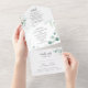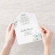 Imagine an all-in-one wedding invitation that beautifully embodies a botanical theme, creating a seamless blend of nature and elegance. The invitation opens to reveal a captivating bouquet of eucalyptus and leaves, capturing the essence of a lush garden.