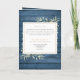 A personalized order of service funeral memorial folded program featuring greenery on a rustic blue wood panels background. Designed by Thisisnotme©