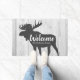 Grey large moose silhouette doormat with the word "Welcome" in white text as well as your family's name. The background is a weathered white grey wood planks print. Add some style and fun to your entryway with this rustic bold doormat.