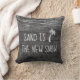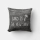 For the family that celebrates their holidays in the tropics, this pillow displays a cute palm tree icon with the sentiment fun "Sand is the New Snow." It features white chalk-styled typography set on a monochrome grey rustic wood background with twinkling string lights.