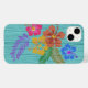 Rustic Hawaiian flowers and leaves iPhone 6s case. Colourful hibiscus flowers, in pink, blue and yellow are printed over an aqua blue wood background.
