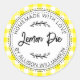 Rustic and simple homemade baked goods apple pie sticker with the text homemade with love, lemon pie and your name in handwritten chic script calligraphy and modern typography on a bright yellow check pattern background with a stylish touch of foliage. Simply add your name and the product name to the label. Exclusively designed for you by Happy Dolphin Studio. If you need any help or matching products, please contact us at happydolphinstudio@outlook.com.