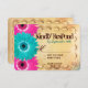 This wedding response card has a vintage distressed brown background with elegant decorative edging and fuchsia hot pink and teal gerber daisies. The wording has accent colours in teal turquoise aqua blue and hot pink. Great for country weddings, barn weddings, vintage weddings and country western weddings. Choose from square or rounded corners.