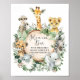 This design features rustic watercolor botanical greenery and adorable jungle animals