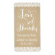 Wedding favour stickers / labels for bottles of wine feature "Love and Thanks" in white script, custom text for the type of wine and for a wedding monogram of the bride and groom names and wedding date, a charming illustrated border design of floral lace, and a background with a rustic kraft brown paper textured appearance.