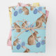 A luxurious heavyweight wrapping paper featuring watercolor painted Easter bunnies sharing their colourful egg hunt finds on Easter coloured background colours.