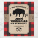 A background of red buffalo plaid contrasts against a kraft paper look panel held on by a burlap strap. The panel holds the party information featuring a bison or buffalo between two pine trees. Great for a birthday, bachelor party, seasonal event, or a plaid or lumberjack themed celebration. The crossed axe makes a custom logo below. Available with matching products.