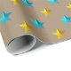 A festive wrapping paper for the Christmas holiday season featuring turquoise blue and gold stars on a rustic kraft paper background. Great for any occasion and makes an impressive gift wrap.