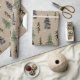A rustic kraft wrapping paper featuring watercolor-painted pine and spruce trees in large scale with lightly falling snowflakes.