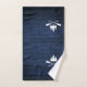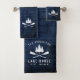 Un bel ensemble de serviettes de bain à thème rustique, avec votre nom de famille et "Lake House" ou tout autre texte désiré ainsi que sa date et son emplacement établis. Ce design personnalisé et unique présente une silhouette blanche de barques croisées et de pins sur un imprimé de planches de bois aux couleurs bleues riches. Pour voir d'autres modèles comme celui-ci, n'hésitez pas à visiter ma boutique ici à "Zazzle.com/Rustic_Charm". Merci .