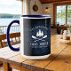 A beautiful, rustic themed, two tone large coffee mug featuring your family name and "Lake House" or other desired text along with its established date and location. This custom, unique design features a white silhouette of crossed boat oars and pine trees on a print of wood planks in rich blue colours. To see more designs like this, feel free to visit my store here at "Zazzle.com/Rustic_Charm". Thanks.