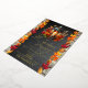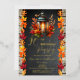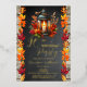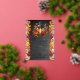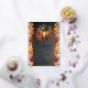 Birthday celebration design featuring a beautiful autumn lantern with lit candle as a centerpiece to a table arrangement of beautiful fall leaves in vibrant autumn splendour. The background features a chalkboard distressed design flanked on either side with gorgeous fall leaves, and backed by a rustic washed wood planks look background. Composite design by Holiday Hearts Designs.