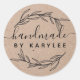 Rustic round sticker featuring laurel leaf, script calligraphy "handmade" with modern typography.