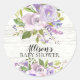 Pretty baby shower favour seal featuring a watercolor purple lavender floral bouquet set on a rustic wood background