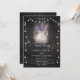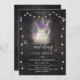 A flower pot covered in lace, filled with lavender and wheat and hand-painted in digital watercolor, decorates this rustic elegant wedding invitation that also features a wood board background and strings of lights. Romantic and charming, it is a lovely choice for a barn wedding, an outdoor wedding, a garden wedding or any rustic setting.