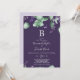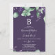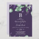 This rustic lavender purple monogram wedding invitation is perfect for a simple and elegant outdoor wedding. The floral design features watercolor eucalyptus leaves and greenery with sprigs of purple wildflowers on a plum purple background. Personalize the card with your last initial monogram.