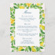 This wedding invitation collection suite is beautifully designed with watercolor illustrations of fresh lemons and leaves. The mixed colours of the watercolor create a calming and elegant backdrop for the design suite. The fonts used for the text are sleek and refined, adding a touch of sophistication to the design.
